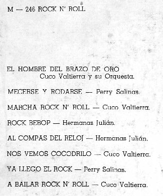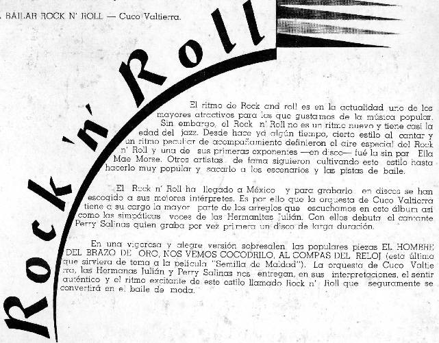 La orquesta de Cuco VALTIERRA , las HERMANAS JULIAN y Perry SALINAS nos estregan , en sus interpretaciones , el sentir autentico y el ritmo excitante de este estilo llamado ROCK and ROLL que seguramente se convertira en el baile de moda . "