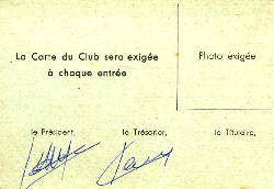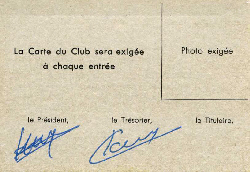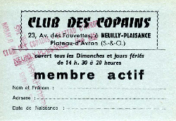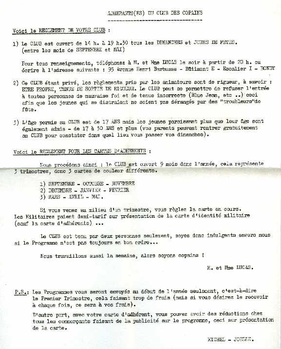 Ce CLUB étant privé , les règlements pris par les animateurs sont de rigueur , à savoir : ÊTRE PROPRE , TENUE DE SORTIE DE RIGUEUR . Le CLUB peut se permettre de refuser l' entrée à toutes personnes de mauvaise foi et de tenue incorrecte ( Blue Jean , etc .. ) ceci afin que les jeunes qui se distraient ne soient pas dérangés par des" troubleurs " de fête .